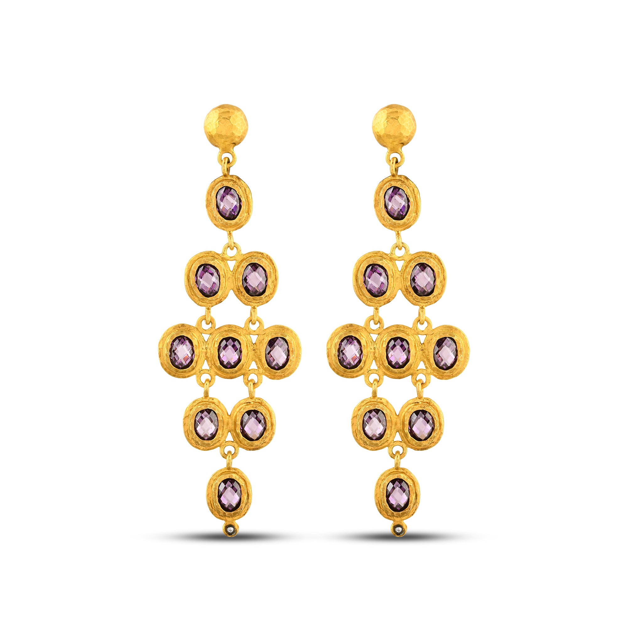Shaped like the glow of evening settling over wide-open plains, these cascading earrings blend warm gold with violet stones that shimmer like twilight on desert sand. Their cross-like silhouette carries the quiet strength of the frontier — bold, free, and effortlessly elegant. Prairie Twilight Cascades are made for those who move through the world with the same steady grace as a rider crossing the endless West.