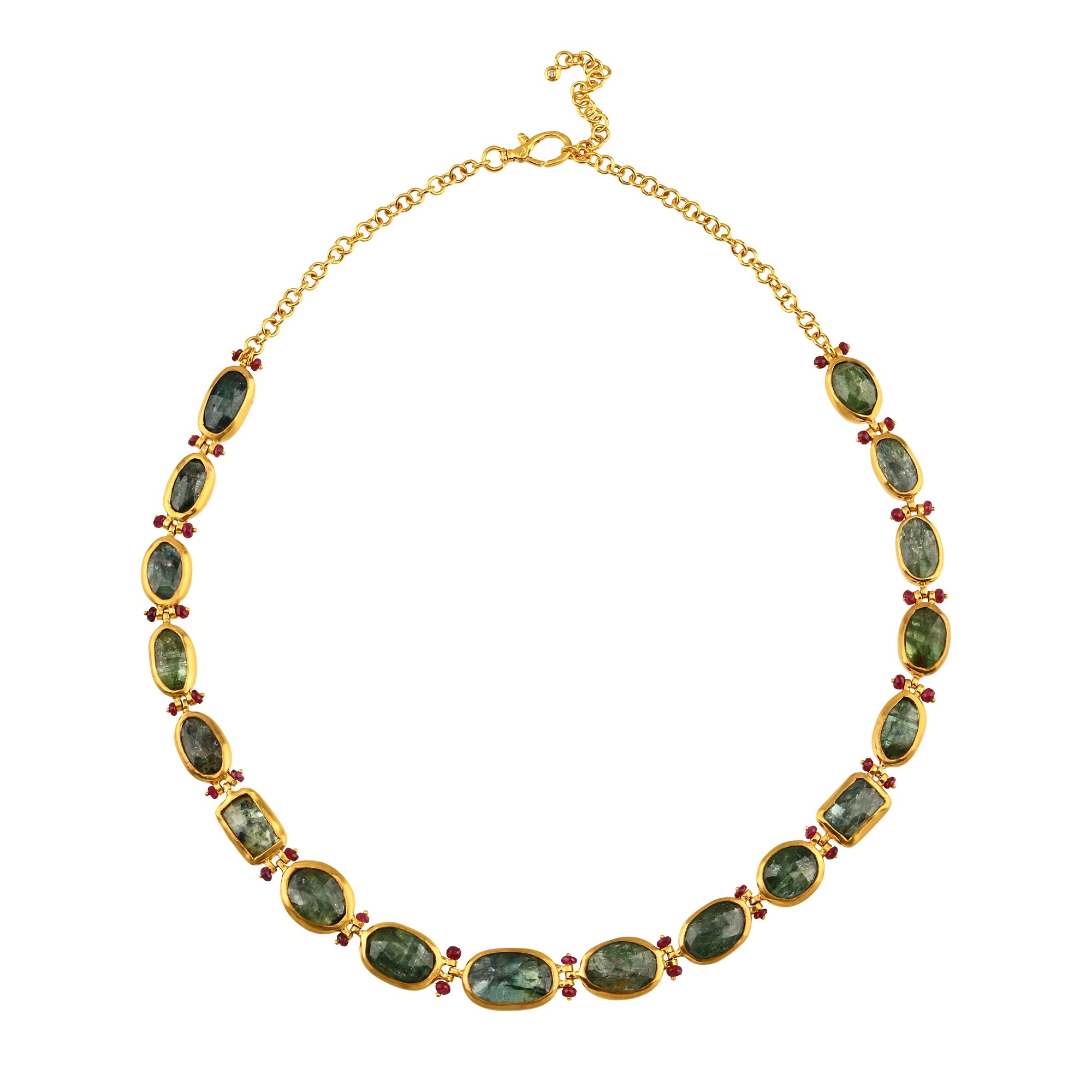 Discovered in the trading archives of the 1870s, green tourmalines were once prized by frontier explorers who believed the stones carried the calm of untouched landscapes. Frontier Moss draws from that belief — deep forest hues framed in aged gold, like relics gathered from distant riverbeds. The small ruby accents echo the embers of campfires burning across wild terrains. Each stone tells a tale of travel and endurance, of beauty found in remote silence. This necklace recalls the quiet elegance of a time when even the harshest journeys were marked by moments of grace.