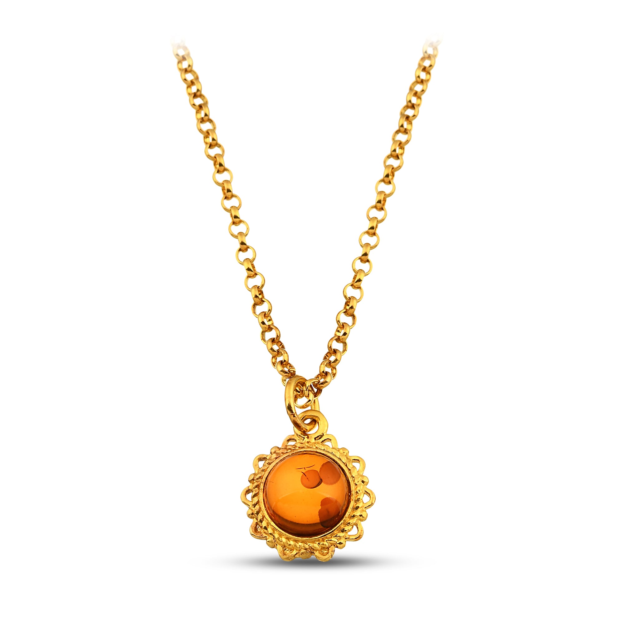 A warm sphere of amber sits at the center like a drop of captured sunlight, framed with delicate golden lacework that feels softly vintage yet effortlessly modern. Honeydrop Medallion carries a gentle glow — the kind that makes you think of late-summer afternoons, warm skin, and quiet moments. It’s a tiny treasure with a naturally radiant soul.