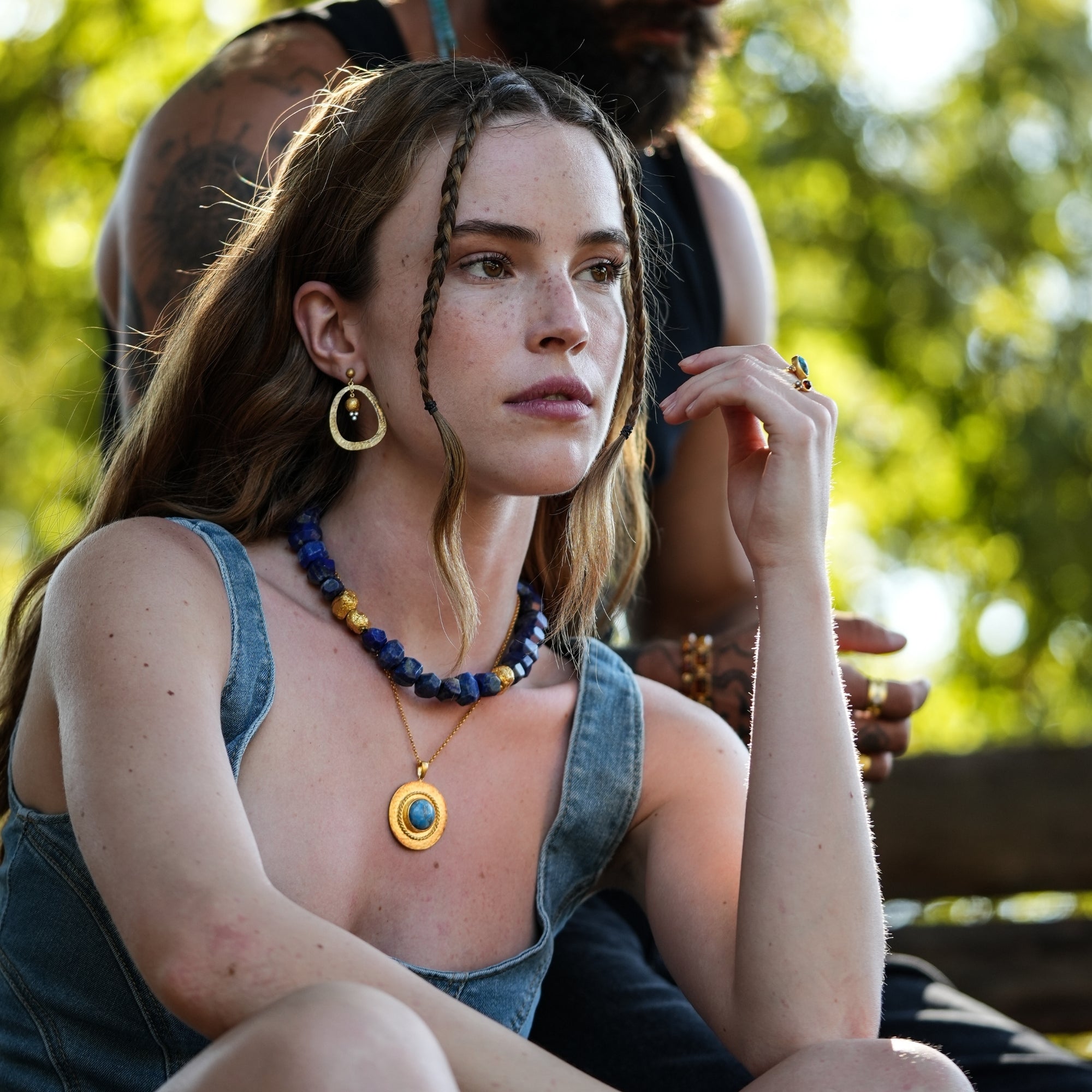 Bathed in the warm glow of Western sunsets, the Turquoise Sunwheel carries the spirit of open plains and endless freedom. At its center rests a vibrant turquoise stone — the “sky stone” cherished by riders and wanderers for centuries — framed by a sun-disk design that echoes frontier hats and blazing horizons. This pendant is a quiet tribute to days spent under wide skies, where every sunrise feels like a new beginning and every journey starts with light.