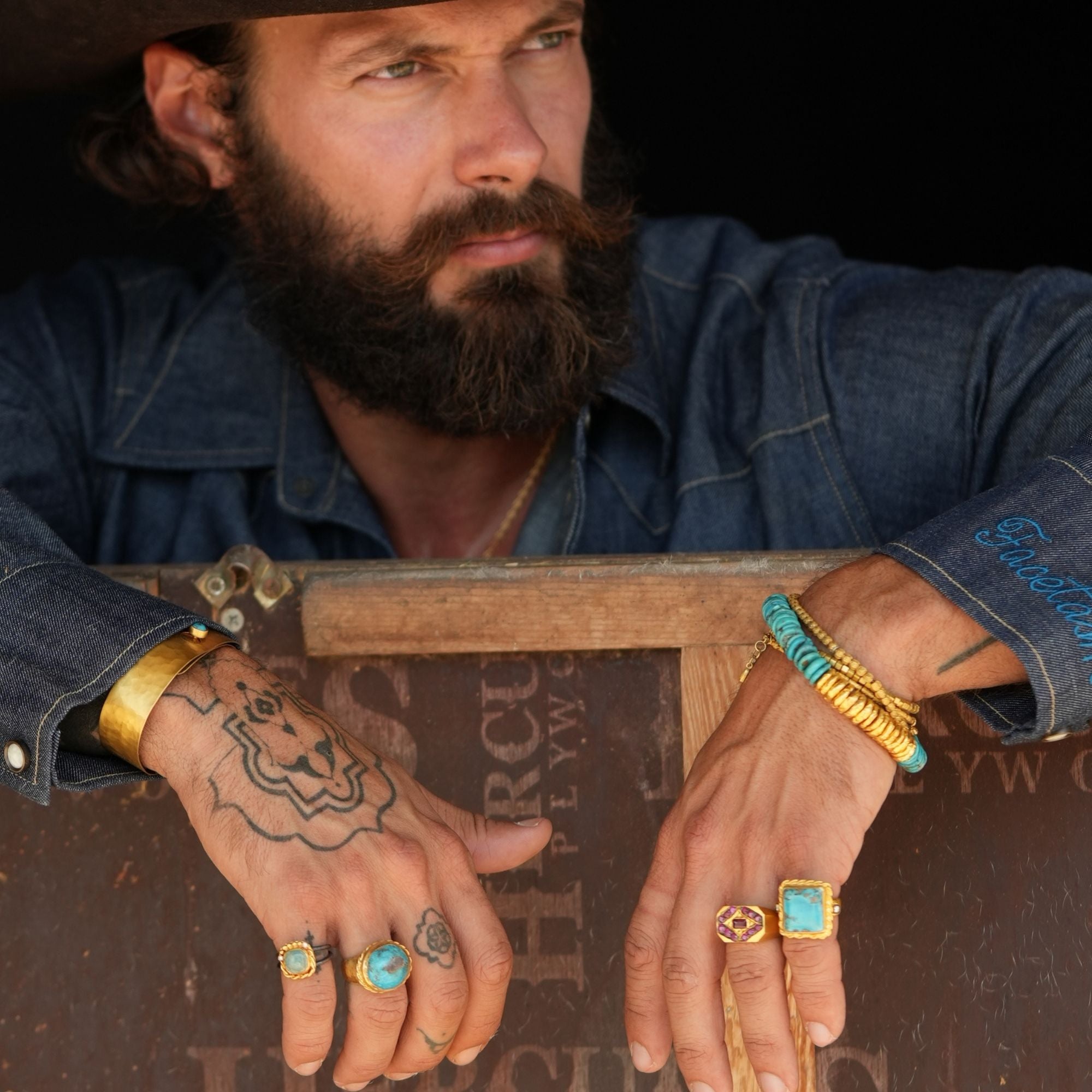 Named after the storied mining town of Tombstone, Arizona — a place where fortune, dust, and legend intertwined — Tombstone Trail echoes the spirit of those who carved life from the desert’s edge. The raw turquoise stones recall the earth once sifted by prospectors in search of silver and sky-colored gems, while the gold discs mirror the gleam of sunlight on weathered saddles and spurs. Each bead carries a trace of resilience, of dust-covered boots crossing endless plains. This bracelet stands as a relic of the frontier’s bold heart — a symbol of endurance, discovery, and quiet triumph beneath the Western sun.