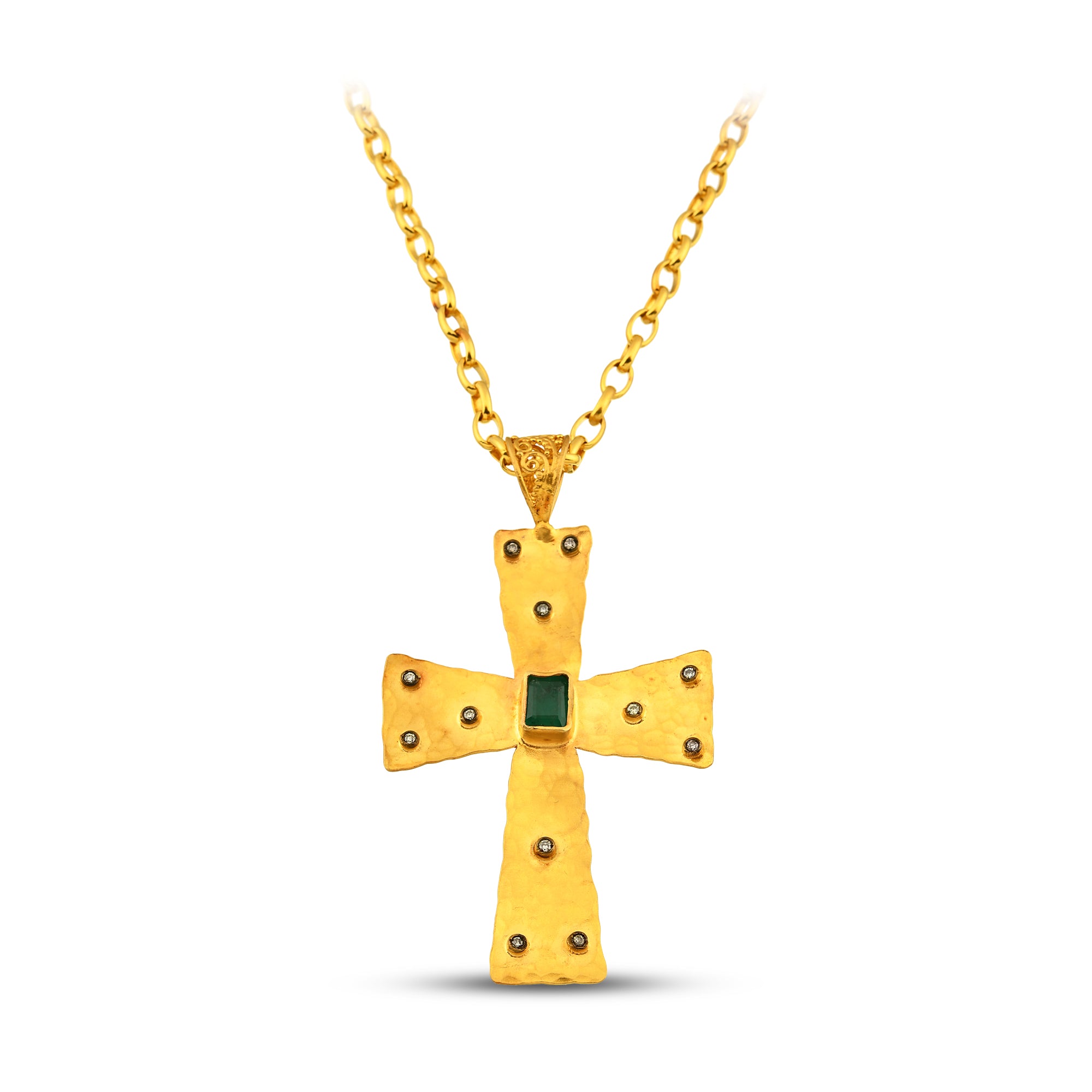 With its hammered gold surface and dark-set accents, this cross has the quiet authority of an object shaped by time. At the center, a deep green stone anchors the design — a calm, steady point of focus. Strong, minimal, and dignified, it feels like a guardian piece meant to accompany its wearer through every chapter.