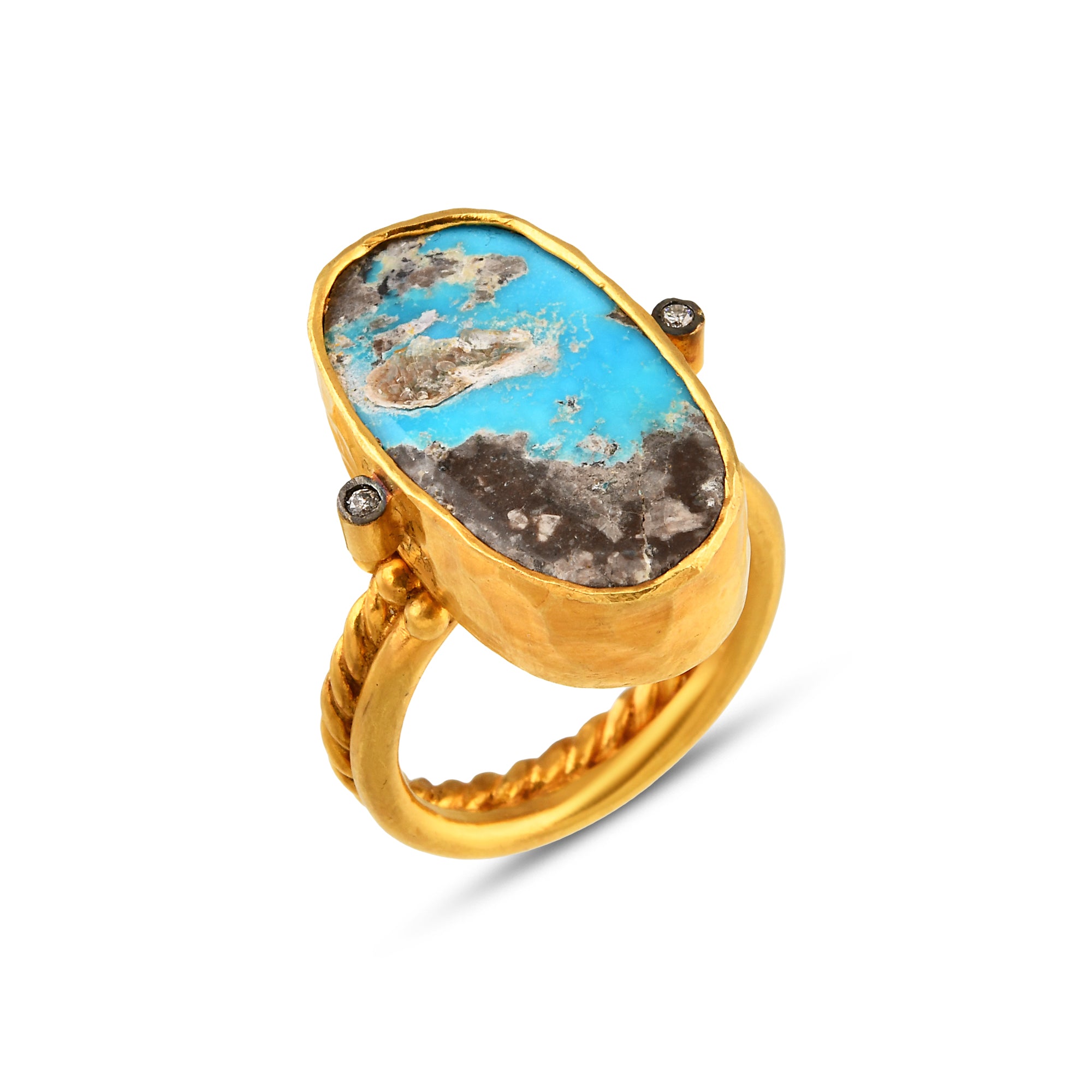 Born from the rugged mines of Nevada’s turquoise country, Nevada Sky captures the raw poetry of the desert — where earth and horizon meet in endless conversation. The stone’s natural matrix tells of untouched land and time-worn beauty, each mark a testament to the hand of nature. Frontier travelers once traded such turquoise as symbols of truth and safe passage beneath vast, unbroken skies. Set in warm gold with a rope band echoing lasso and craft, this ring carries the soul of the American West — unrefined, luminous, and eternally free.