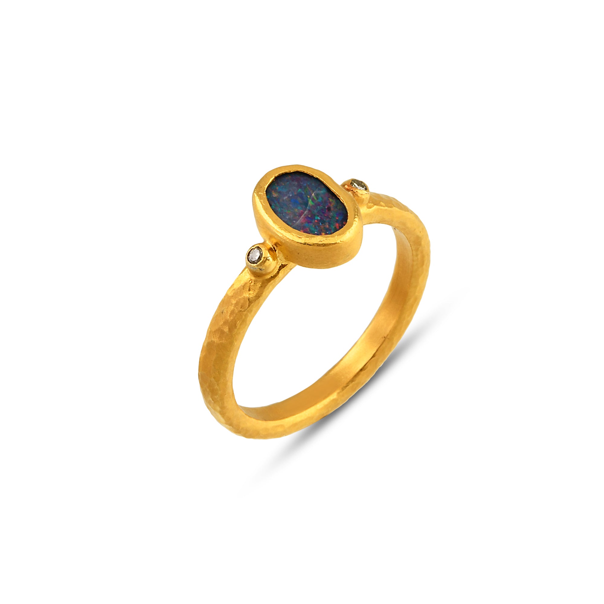 Opal Creek takes its name from the quiet mountain streams that shimmered with hidden color after rainfall in the old frontier. Early settlers believed opals held the magic of trapped lightning — rare stones that reflected both earth and sky. The ring’s hammered gold band recalls the hand-forged tools of miners who once sought such treasures in Oregon’s highlands. Its iridescent stone glows like sunlight rippling across water, shifting from deep blue to fiery red. A piece that feels alive — a keepsake of nature’s brilliance, forged where wilderness met wonder.