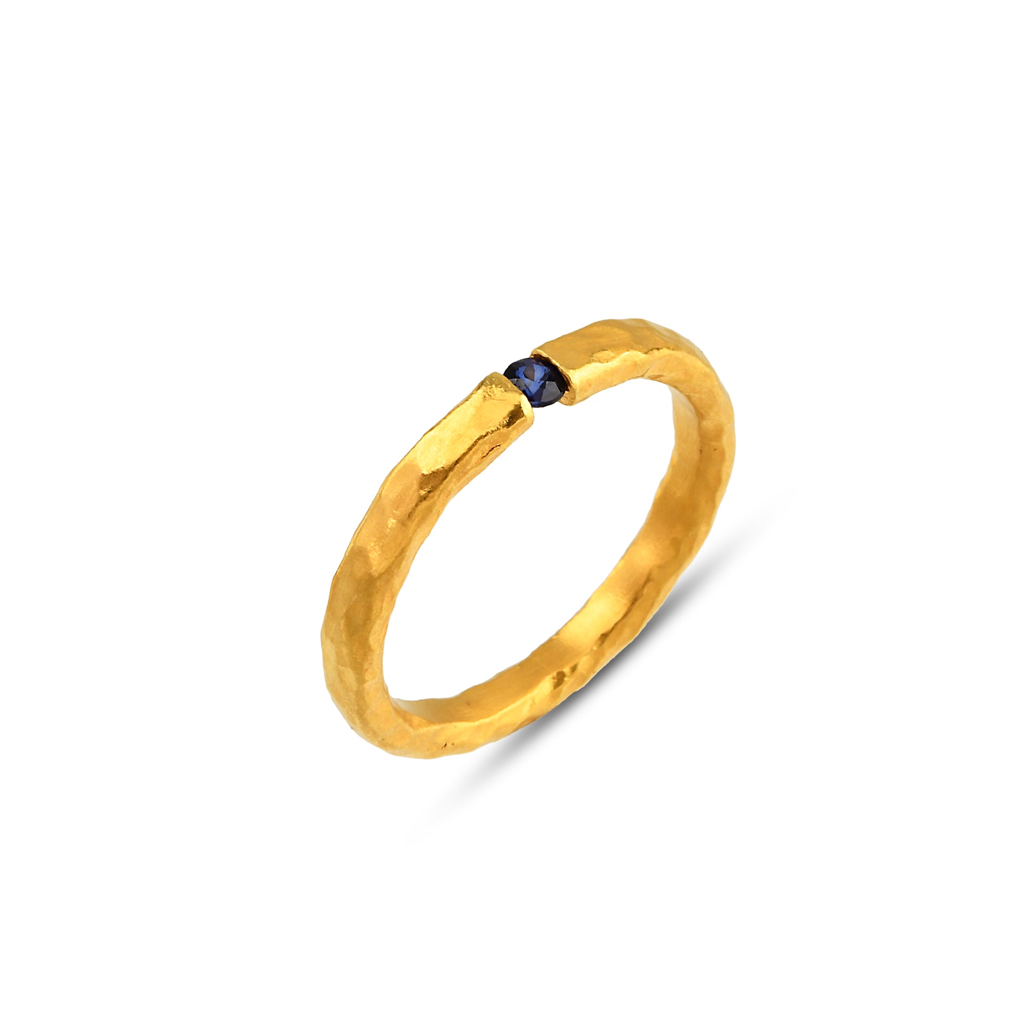 Blue Canyon takes its name from the narrow gorges of the Southwest, where the deep indigo sky meets golden cliffs at dusk. The ring’s raw, hand-forged form mirrors the textures of weathered rock shaped by wind and time, while the small sapphire glint evokes a hidden stream flowing through desert stone. In the 1800s, such gems were carried by travelers as tokens of luck — reminders of water, light, and endurance. Simple yet profound, this ring captures the quiet strength of the West — where beauty is carved, not polished, by the journey itself.